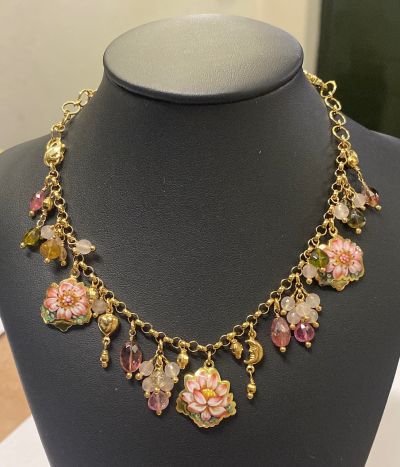 Collana girocollo in oro 18kt con ciodoli in oro smaltato a mano e pietre preziose.